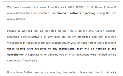 最近不少同學(xué)反饋說,自己幾個月1前考的在家托福成績被ETS取消了,根據(jù)ETS發(fā)的郵件說,理由是:had unauthorized software operating(使用了與考試無關(guān)的軟件)。